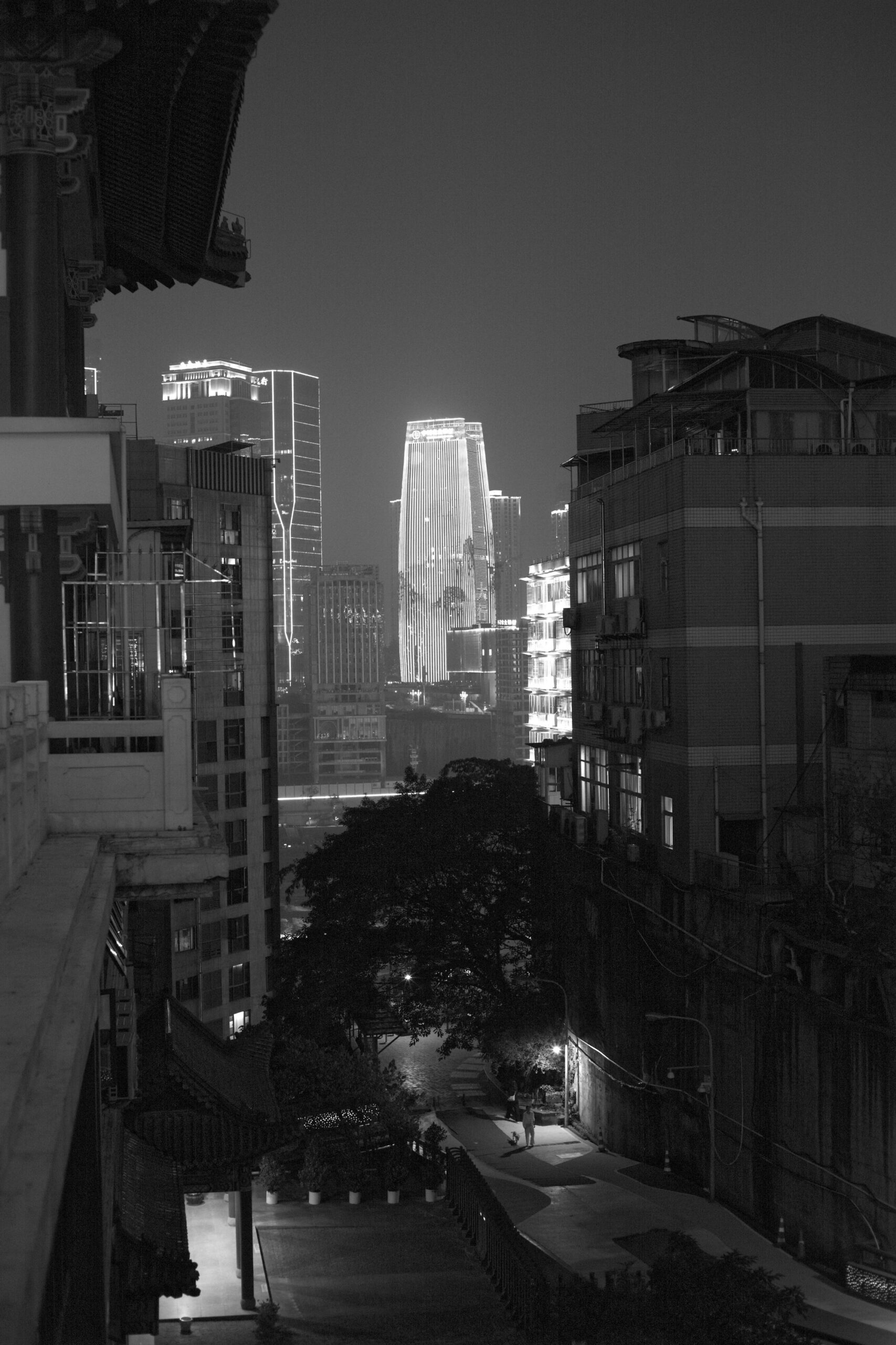 A street of Yuzhong District and the light show of Southern District at night.