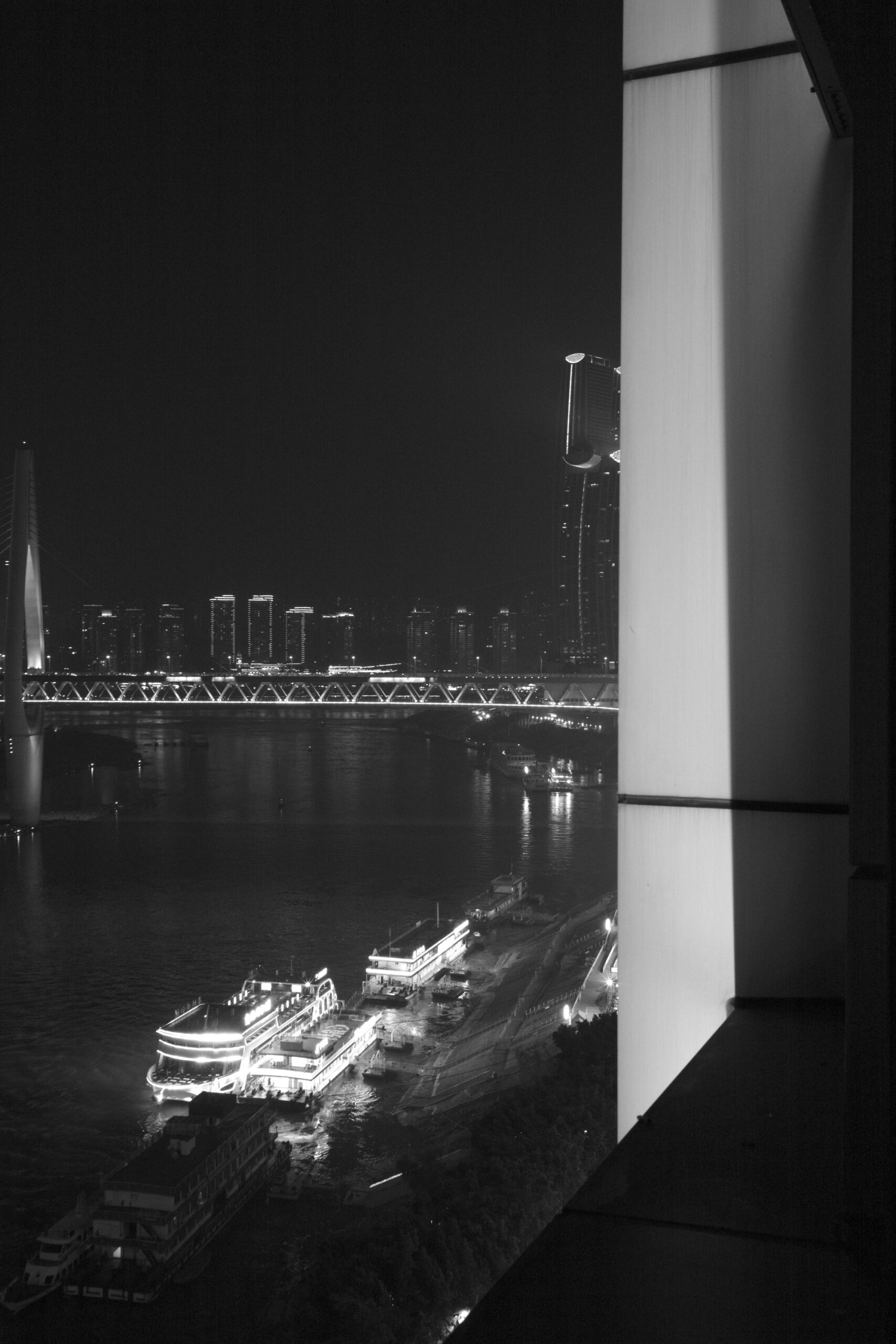Buildings, bridge, criuses, ferry terminal, and Jialing River at night out of windows of hotel room.