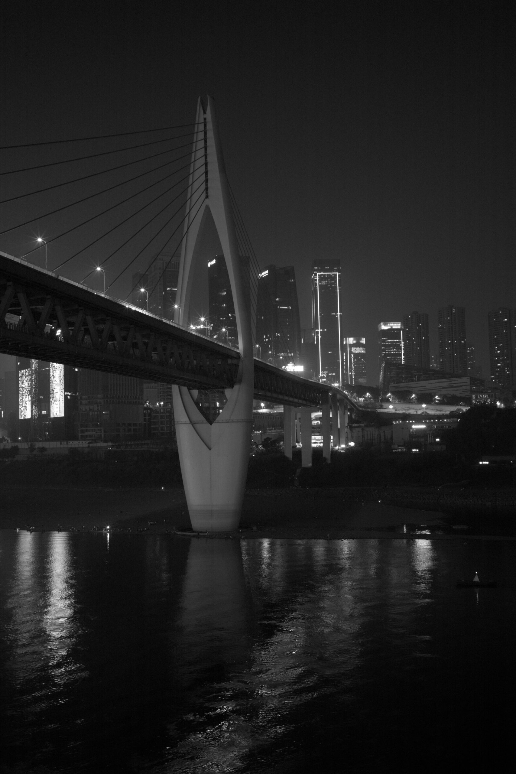 夜里的千斯门大桥和嘉陵江上的渡轮码头。